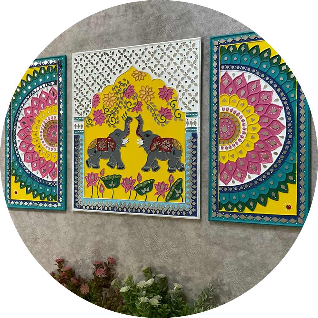 Traditional mud and mirror work from Kutch. Adds a sparkling, ethnic, and handcrafted touch to foyers and Pooja rooms.